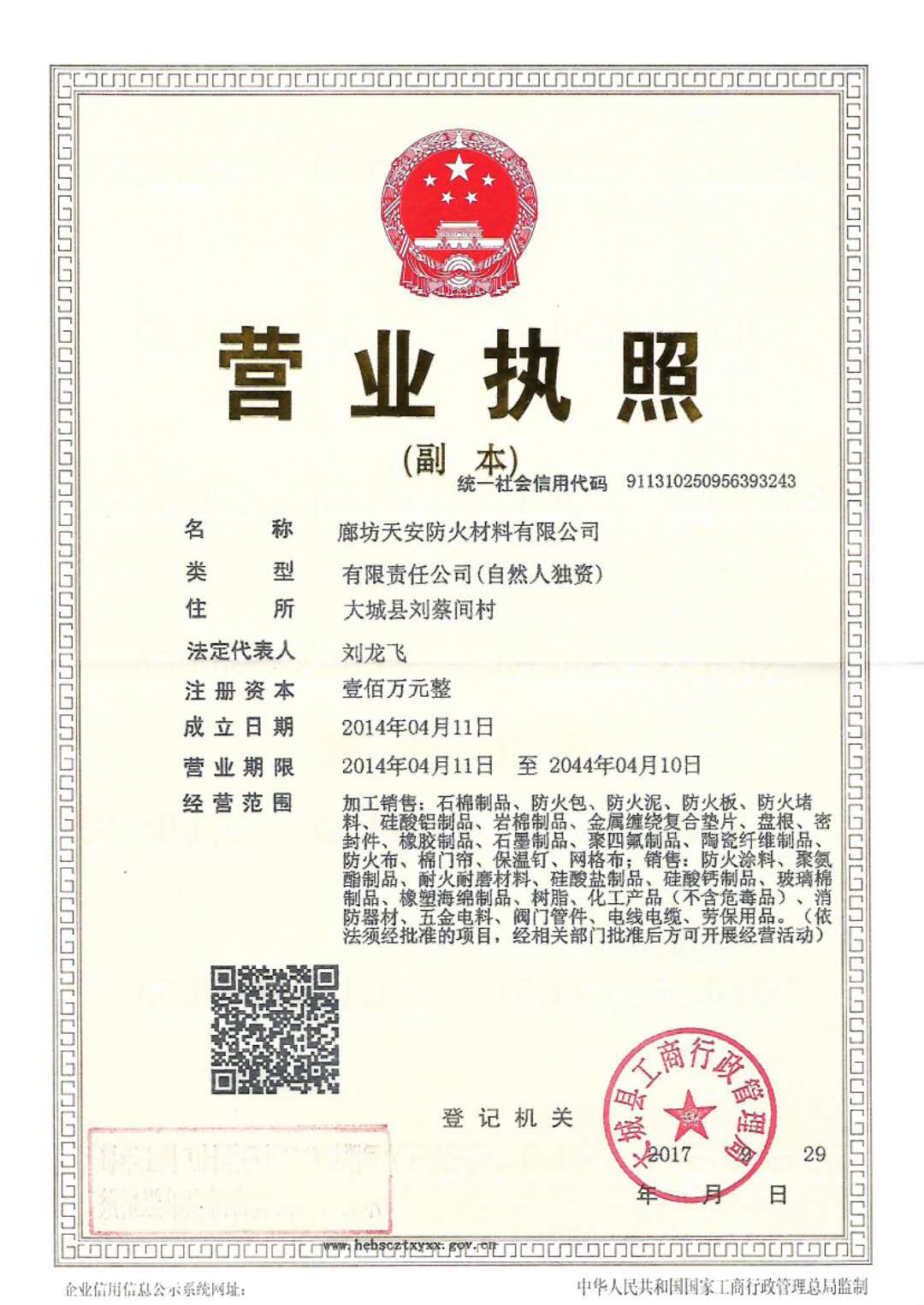 廊坊天安防火材料有限公司,座落在河北省大城縣留各莊工業(yè)區(qū),位于京、津、保三角地帶。 地理位置優(yōu)越!交通十分便利! 我公司擁有國(guó)內(nèi)先進(jìn)的工藝和設(shè)備,企業(yè)規(guī)模、產(chǎn)品質(zhì)量在國(guó)內(nèi)堪稱(chēng)一流。 我公司主要產(chǎn)品有阻火包、柔性有機(jī)堵料、石棉布、石棉繩、石棉帶、石棉絨、石棉板、石棉紙、石棉被、阻火模塊、電纜防火涂料、鋼結(jié)構(gòu)防火涂料、防火板、硅膠布、三防布、玻璃纖維布、硅酸鋁纖維板、 硅酸鋁氈、陶瓷纖維板、陶瓷纖維氈、陶瓷纖維紙、聚四氟乙烯制品、齒形墊、石墨制品、各種盤(pán)根、金屬纏繞墊、密封材料、外墻保溫釘、網(wǎng)格布等產(chǎn)品。產(chǎn)品規(guī)格齊全! 質(zhì)量穩(wěn)定,深受廣大客戶(hù)的認(rèn)可和好評(píng)! “以?xún)?yōu)取勝、以誠(chéng)取信、質(zhì)量第一、用戶(hù)至上”是我公司的宗旨,我公司全體員工將以“開(kāi)拓、進(jìn)取、求實(shí)、創(chuàng)新”的精神與國(guó)內(nèi)外同仁攜手共進(jìn)共創(chuàng)輝煌,共創(chuàng)美好的明天,并期盼更好的與廣大新老客戶(hù)真誠(chéng)合作。